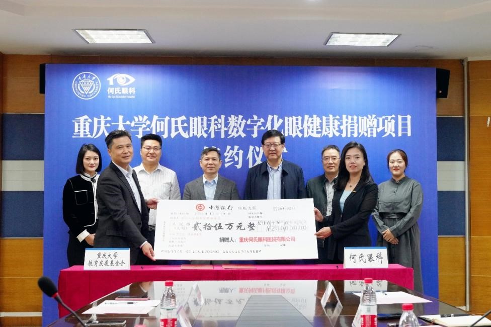 2023年10月10日,重慶何氏眼科醫院與重慶大學教育發展基金會簽約數字化眼健康捐贈項目,重慶何氏眼科醫院有限公司向學校捐贈人民幣25萬元用于為重大學子設立何氏眼科獎學金、大學愛眼社團活動基金,簽約儀式在重慶大學黨委學工部二樓會議室順利舉行。