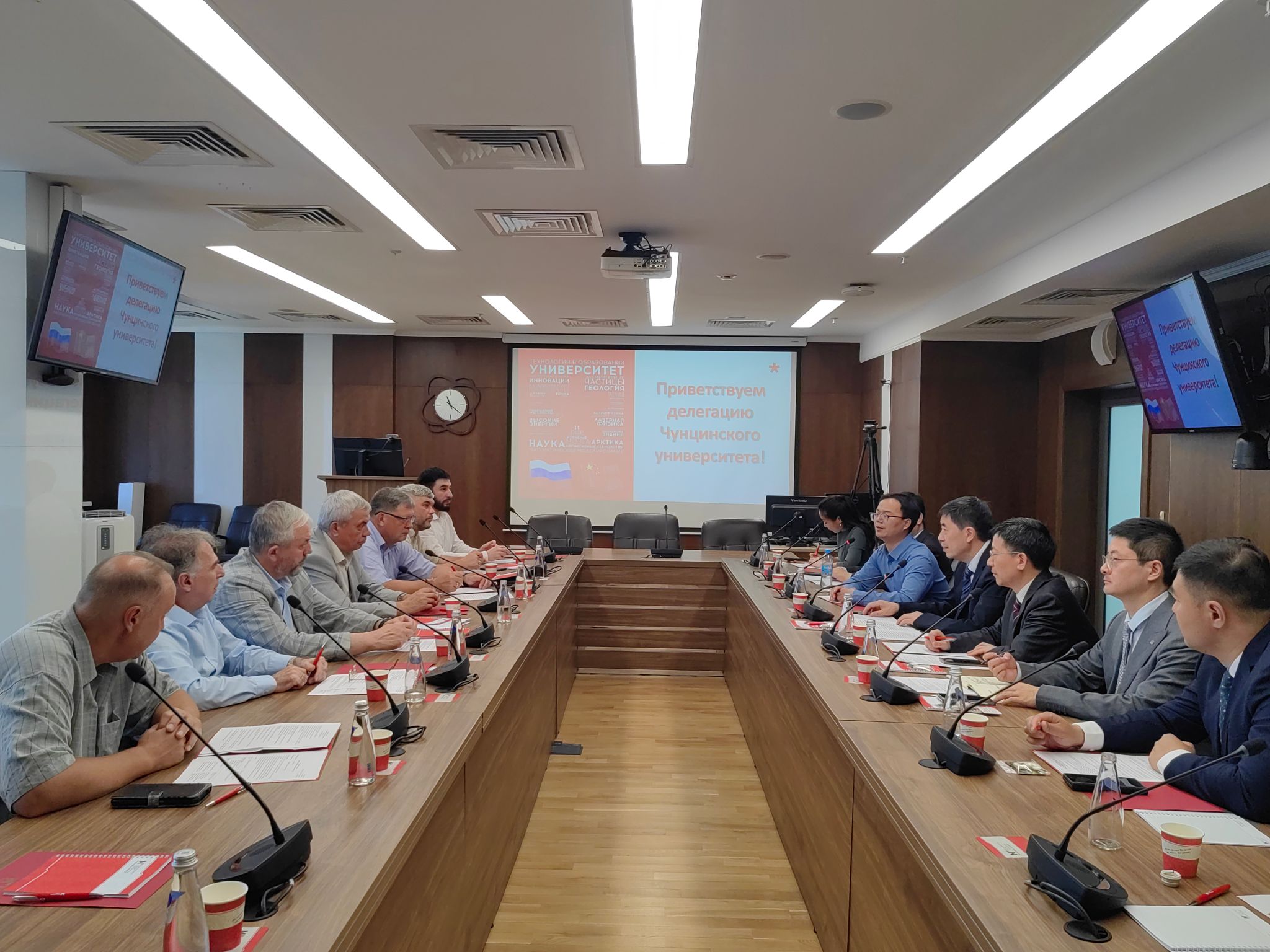 在新西伯利亞國立大學(xué)訪問期間,新西伯利亞國立大學(xué)校長(zhǎng)米哈伊爾·P·費(fèi)多魯克院士及外事副校長(zhǎng)伊戈?duì)枴に_蓋達(dá)克教授與代表團(tuán)進(jìn)行深入會(huì)談。費(fèi)多魯克對(duì)代表團(tuán)來訪表示熱烈歡迎,雙方圍繞合作辦學(xué)項(xiàng)目、聯(lián)合研究中心建設(shè)、科研交流合作等深入討論,為進(jìn)一步深化兩校合作奠定了堅(jiān)實(shí)基礎(chǔ)。會(huì)后還舉行了聯(lián)合基礎(chǔ)研究中心揭牌儀式。